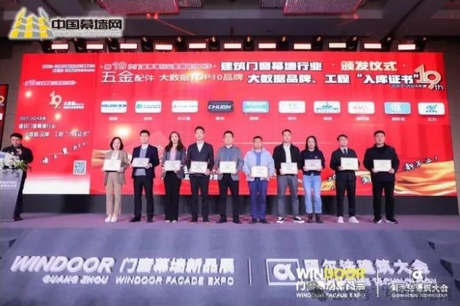 同期,盛大舉行了2023-2024年度“TOP20幕墻工程”,以及“五金TOP10品牌”大數(shù)據(jù)入庫證書的頒發(fā)儀式!