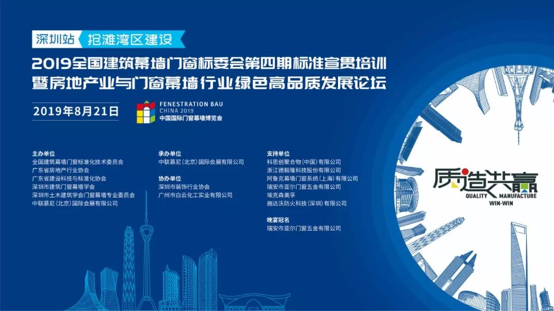 2019年8月21日,由全國建筑幕墻門窗標準化技術委員會、廣東省房地產(chǎn)行業(yè)協(xié)會、廣東省建設科技與標準化協(xié)會、深圳市建筑門窗幕墻學會、深圳市土木建筑學會門窗幕墻專業(yè)委員會、中聯(lián)慕尼(北京)國際會展有限公司共同主辦,深圳市裝飾行業(yè)協(xié)會、廣州市白云化工實業(yè)有限公司協(xié)辦的2019全國建筑幕墻門窗標委會第四期宣貫培訓暨搶灘灣區(qū)建設—房地產(chǎn)業(yè)與門窗幕墻行業(yè)綠色高品質發(fā)展論壇在深圳隆重召開!