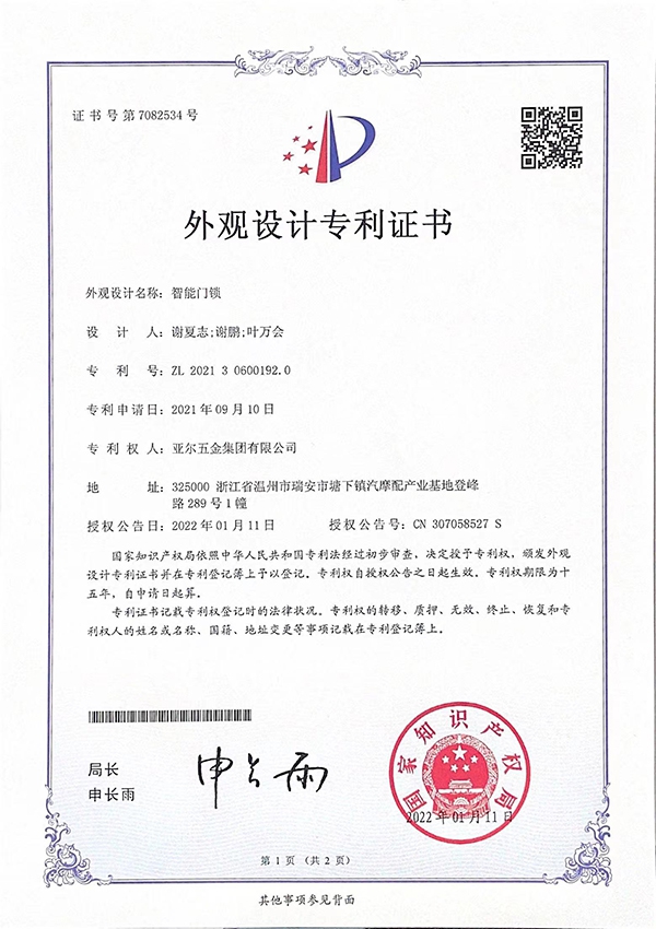 鋁合金門智能化入戶門鎖實(shí)用新型專利證書