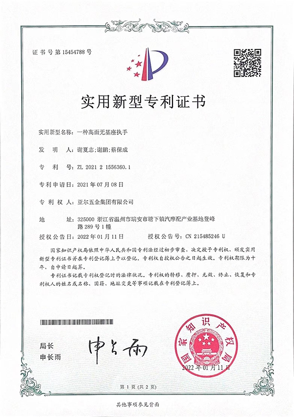一種高面無基座執(zhí)手實(shí)用新型專利證書