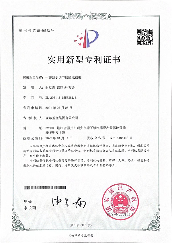 一種便于調(diào)節(jié)的隱藏鉸鏈實(shí)用新型專利證書